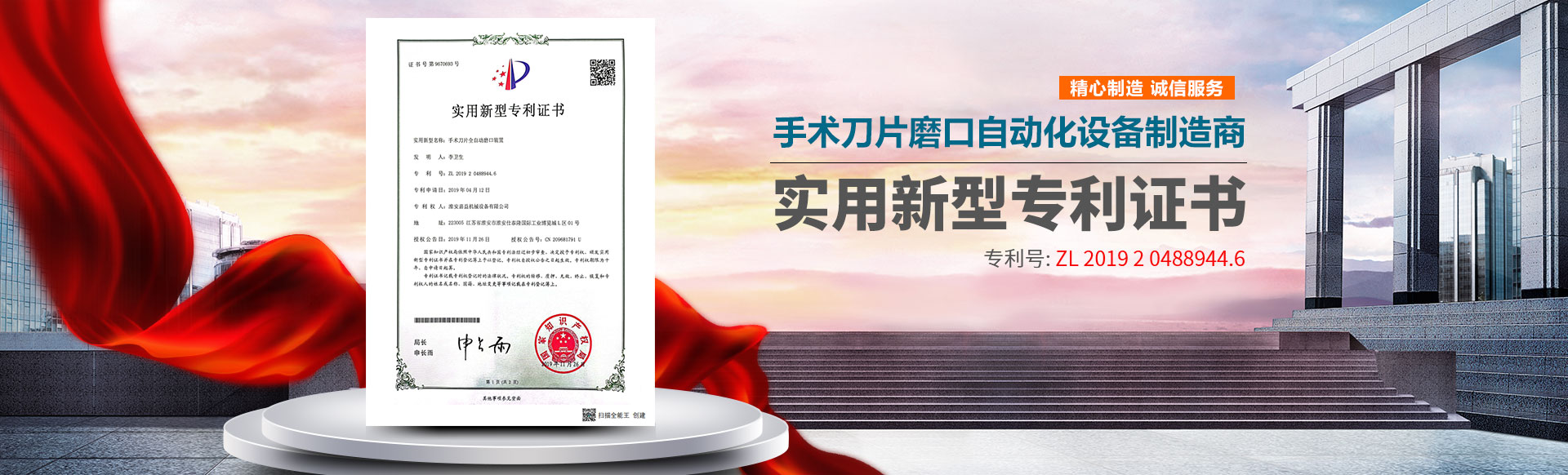 我公司主要設(shè)計(jì)、研發(fā)、生產(chǎn)與銷售手術(shù)刀片磨口自動(dòng)化設(shè)備,擁有專利,專利號為:ZL 2019 2 0488944.6。